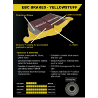 The EBC Yellow Stuff compound is essentially a race pad but with a big difference in that it works from cold and can be safely used on the highway. If you want the ultimate in high friction braking this is the pad to choose. Brakes feel superb from first touch of the pedal and stay effective up to race temperatures. EBC YellowStuff is designed for faster imports and muscle cars where maximum stopping is a prime requirement and for short duration track use. The dust rating is similar to OEM parts. All pads come with edge chamfers, centre line slots, noise reduction shims and OEM hardware as needed. All EBC pads feature the EBC Brake-in surface coating which helps pads seat quickly after install.