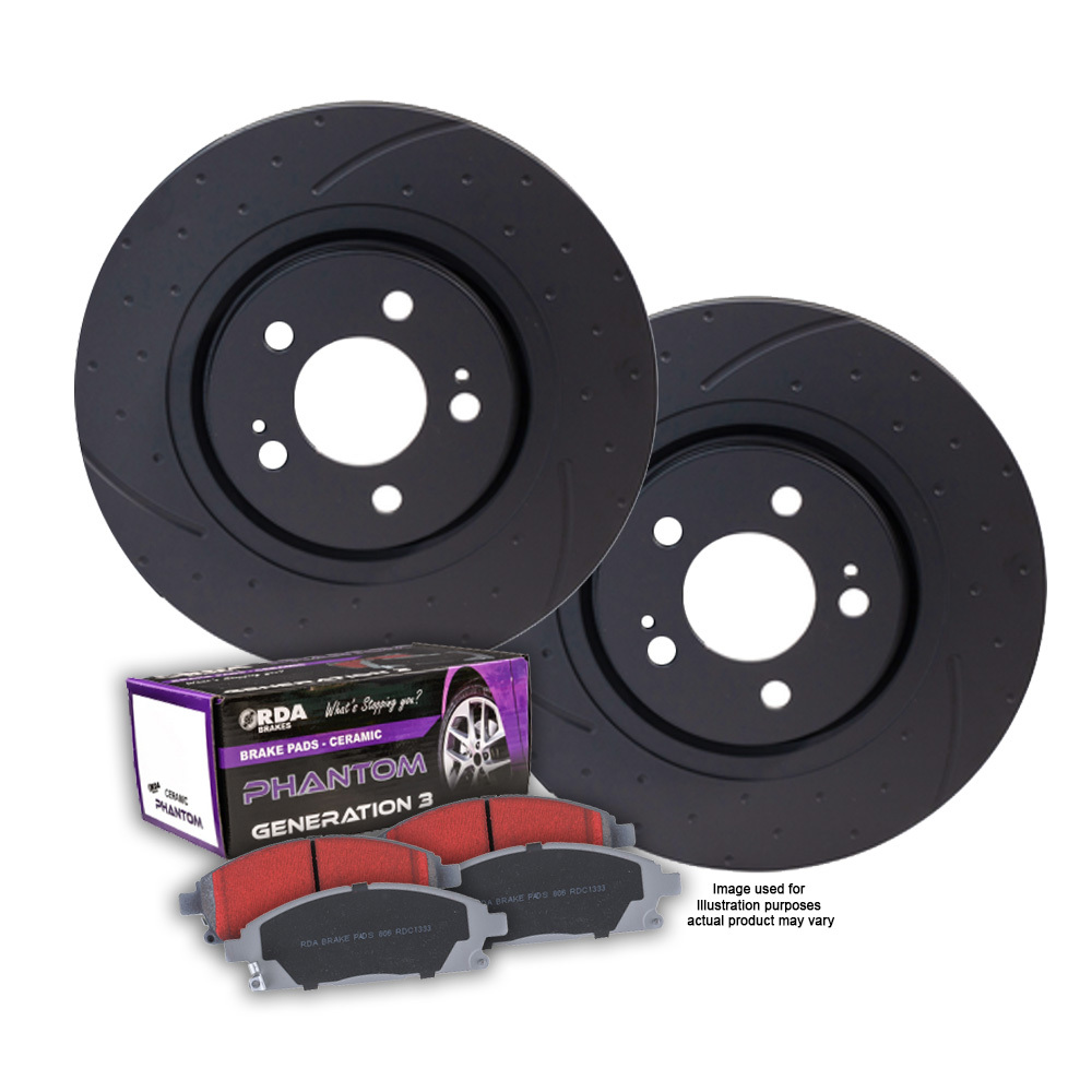 BRAND NEW - GENUINE RDA - DIMPLED & SLOTTED REAR DISC BRAKE ROTORS + RDA PHANTOM CERAMIC BRAKE PADS (Not compatible with HARROP Callipers)
