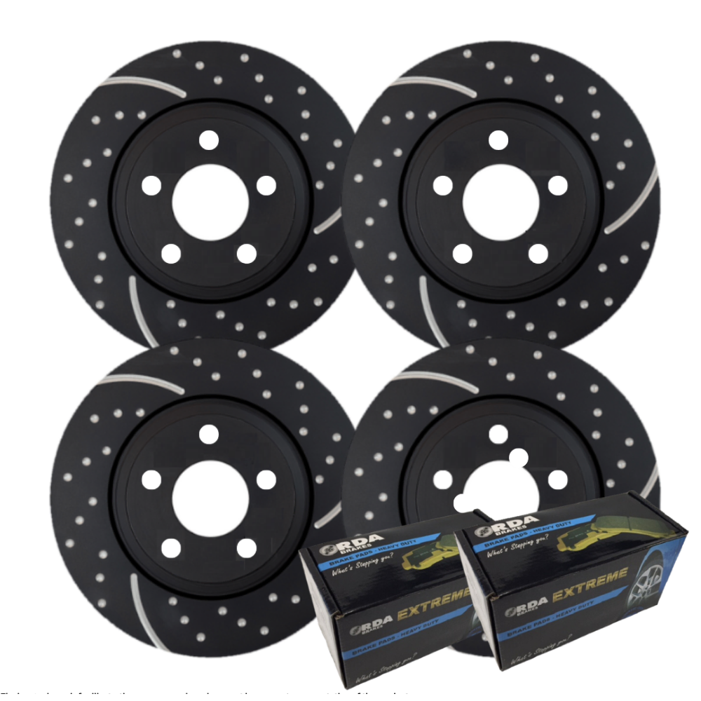 BRAND NEW - GENUINE RDA - FULL SET DIMPLED & SLOTTED FRONT & REAR DISC BRAKE ROTORS + RDA EXTREME BRAKE PADS