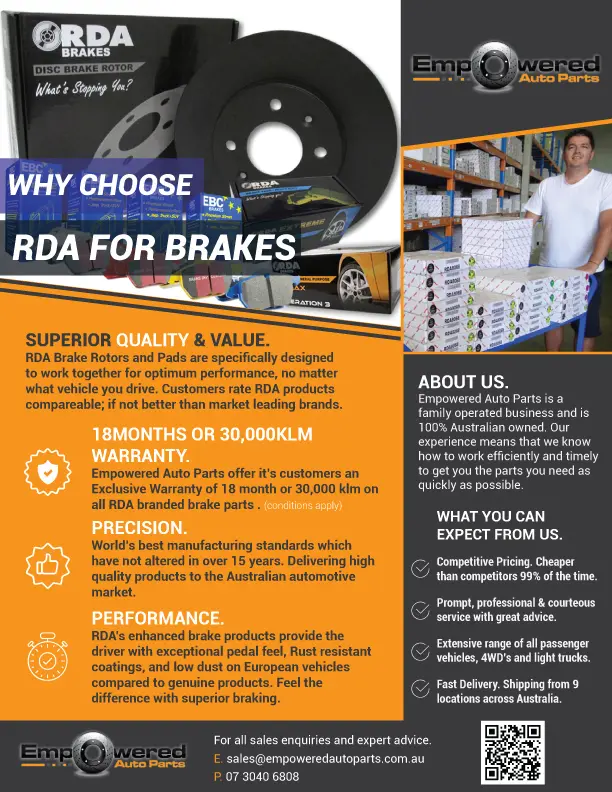 Empowered Auto Parts is an Authorised RDA & EBC brakes supplier, purchasing with us means you have a full extensive Warranty as outlined above. Buying from an un-authorised reseller will compromise your 12 months, 20,000Km warranty..