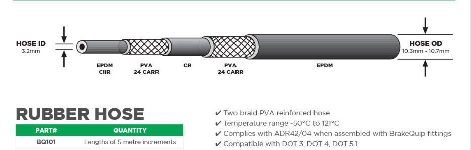 - Compliance: Complies with ADR42/04 when assembled with BrakeQuip fittings